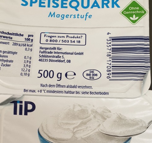 Nährwerte pro 100 g Produktmasse (lt. Hersteller): Energie (Kilokalorien) 68 kcal, Energie (Kilojoule) 289 kJ, Fett 0,3 g, Gesättigte Fettsäuren 0,1 g, Einfach ungesättigte Fettsäuren k.A., Mehrfach ungesättigte Fettsäuren k.A., Kohlenhydrate, resorbierbar 3,9 g, Zucker (gesamt) 3,9 g, Summe Zuckeralkohole k.A., Stärke k.A., Ballaststoffe k.A., Eiweiß (Protein) 12,2 g, Gesamt-Kochsalz 0,1 g“